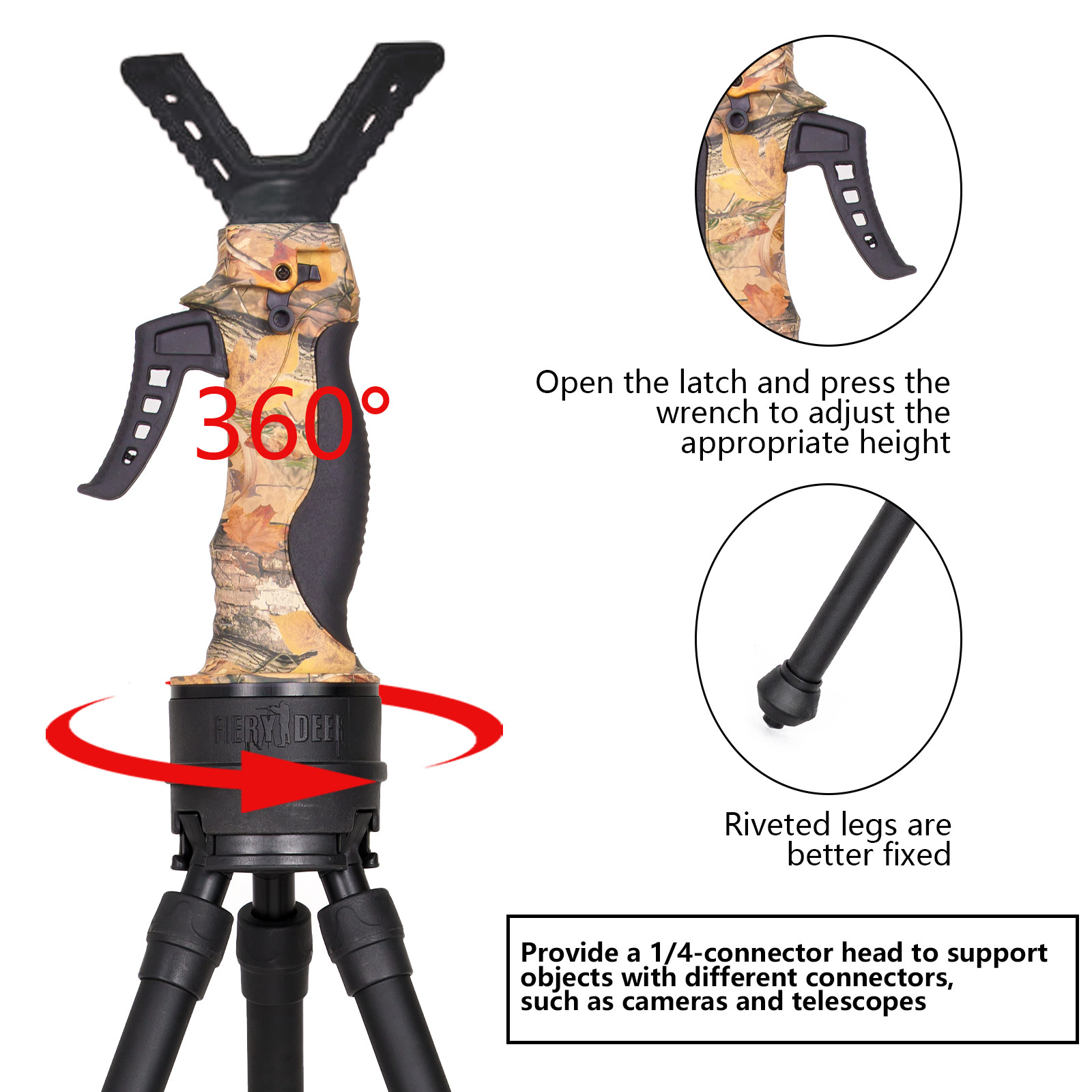 O tripé de tiro FIERYDEER THIRDARMY DX-004-01GEN5 é fabricado na CHINA. É leve em 1500g e tem um polo preto.O pacote inclui uma bolha dupla e um nível de bolhaPossui um alcance de 360° e três secções de pernas.